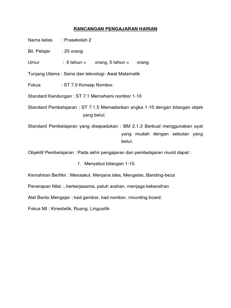 Contoh Lesson Plan Matematik Prasekolah 6 Tahun